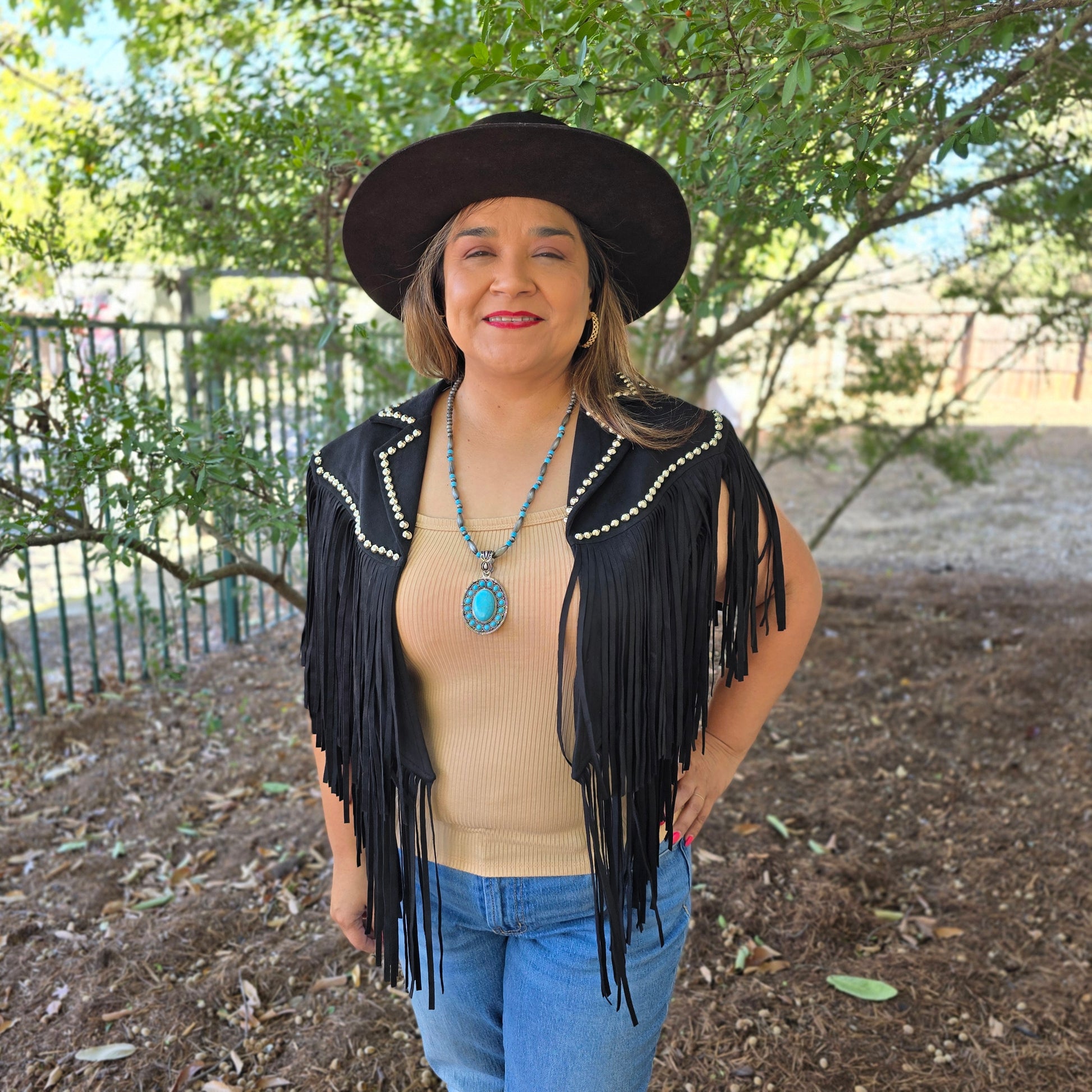 Add instant western flair to any outfit with this statement-making fringe shrug. Designed with dramatic long fringe and silver stud detailing along the shoulders and back, this piece brings movement, texture, and bold cowgirl energy. The open-front, sleeveless design makes it easy to layer over tanks, tees, dresses, or mesh tops without adding bulk. Whether you choose classic black or rich saddle brown, this shrug is the perfect finishing touch for rodeo season, concerts, or a night out.