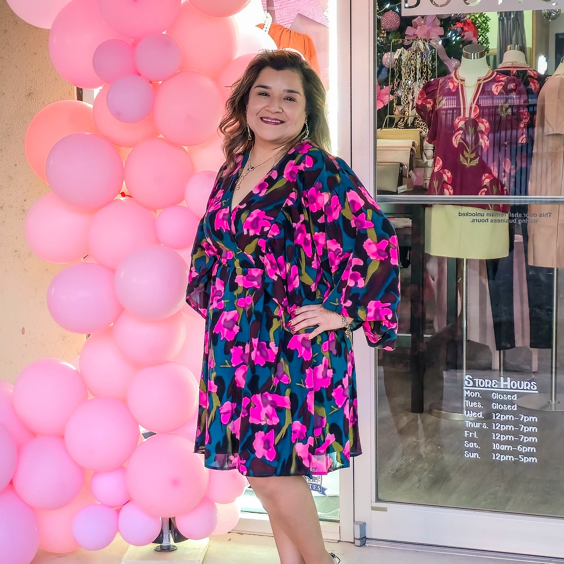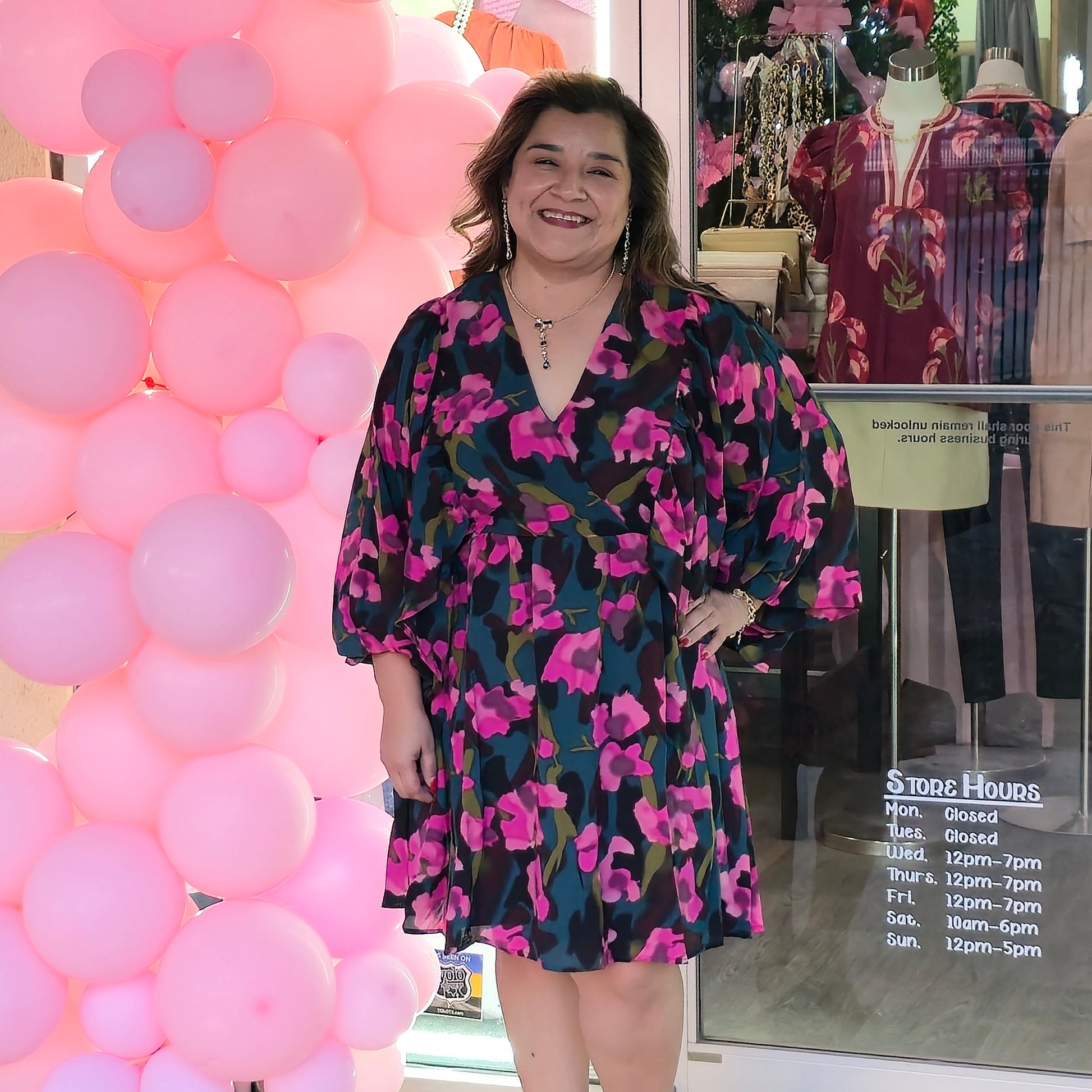 The lightweight, airy fabric and roomy sleeves create a breezy, comfortable feel you’ll love wearing to brunch, events, or a fun night out. The eye-catching floral print in rich jewel tones and pops of hot pink makes this dress a true statement piece.