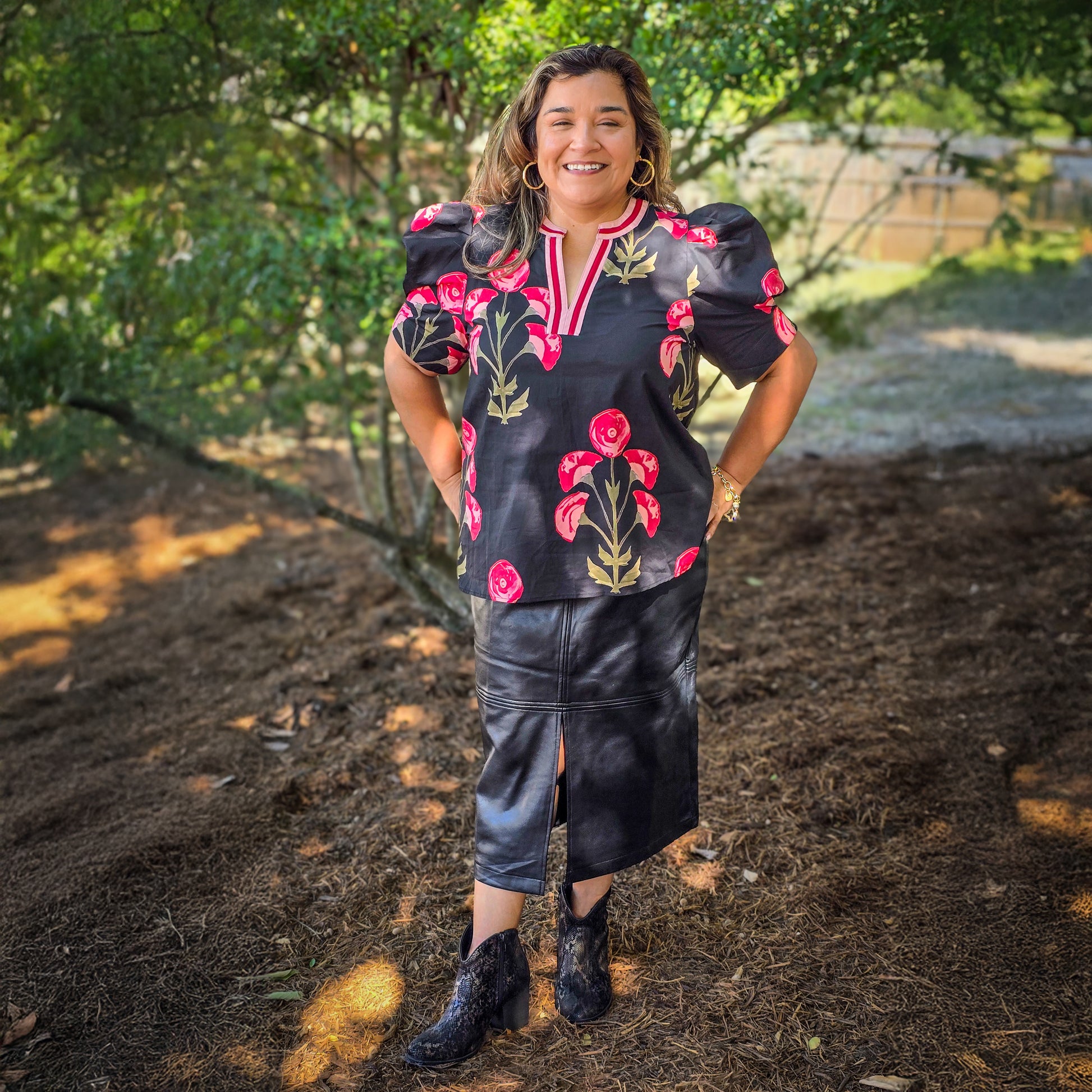 Stand out in style with this Bold Floral Puff Sleeve Top, featuring a gorgeous pink and olive floral print against a deep black backdrop. The statement puff sleeves bring just the right touch of drama, while the notched neckline with pink trim detail adds a pop of modern charm. Made from a soft, lightweight woven fabric that drapes beautifully, this top offers a flattering fit that transitions effortlessly from day to night. Does not stretch. Cotton.