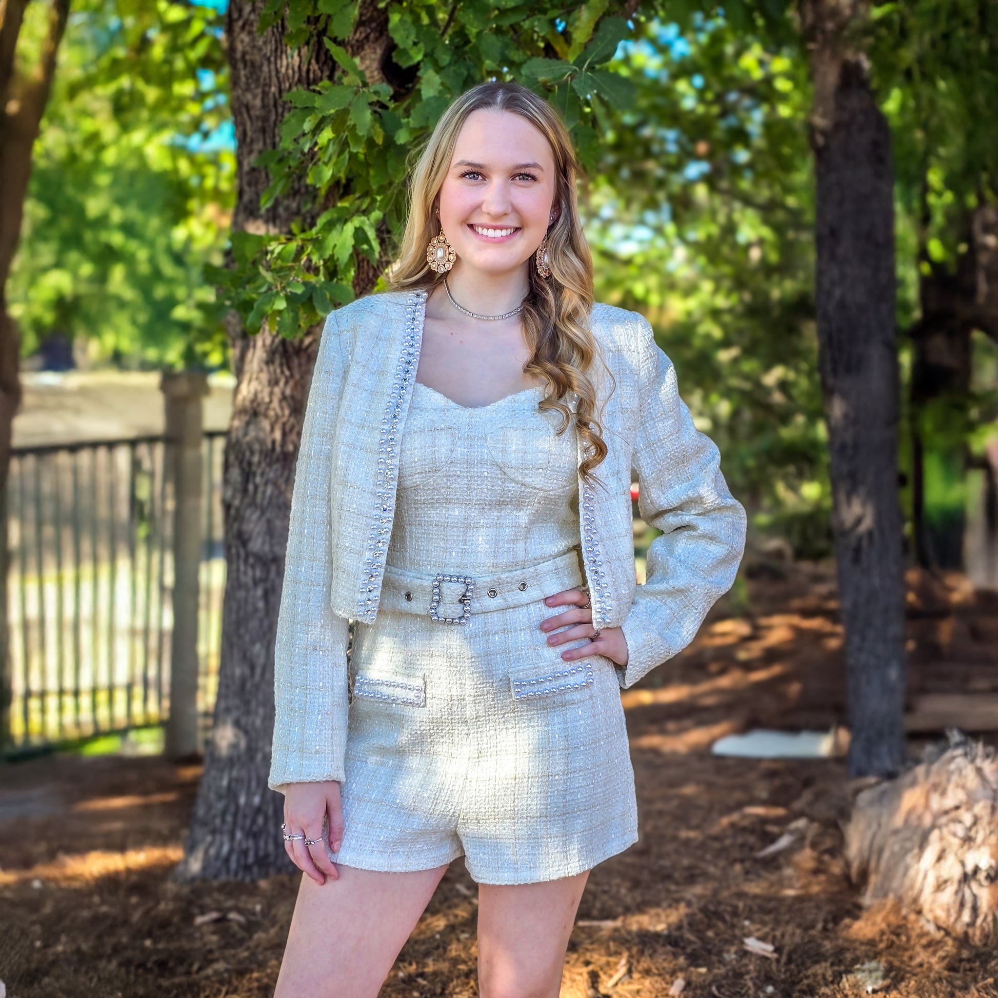 Chic, timeless, and absolutely stunning — this tweed jacket is the statement piece your wardrobe has been waiting for. Designed in a soft cream tweed with a subtle shimmer woven throughout, this jacket brings elegance to every outfit. The real showstopper? The pearl and rhinestone detailing along the lapel and pockets that add the perfect touch of luxe sparkle.