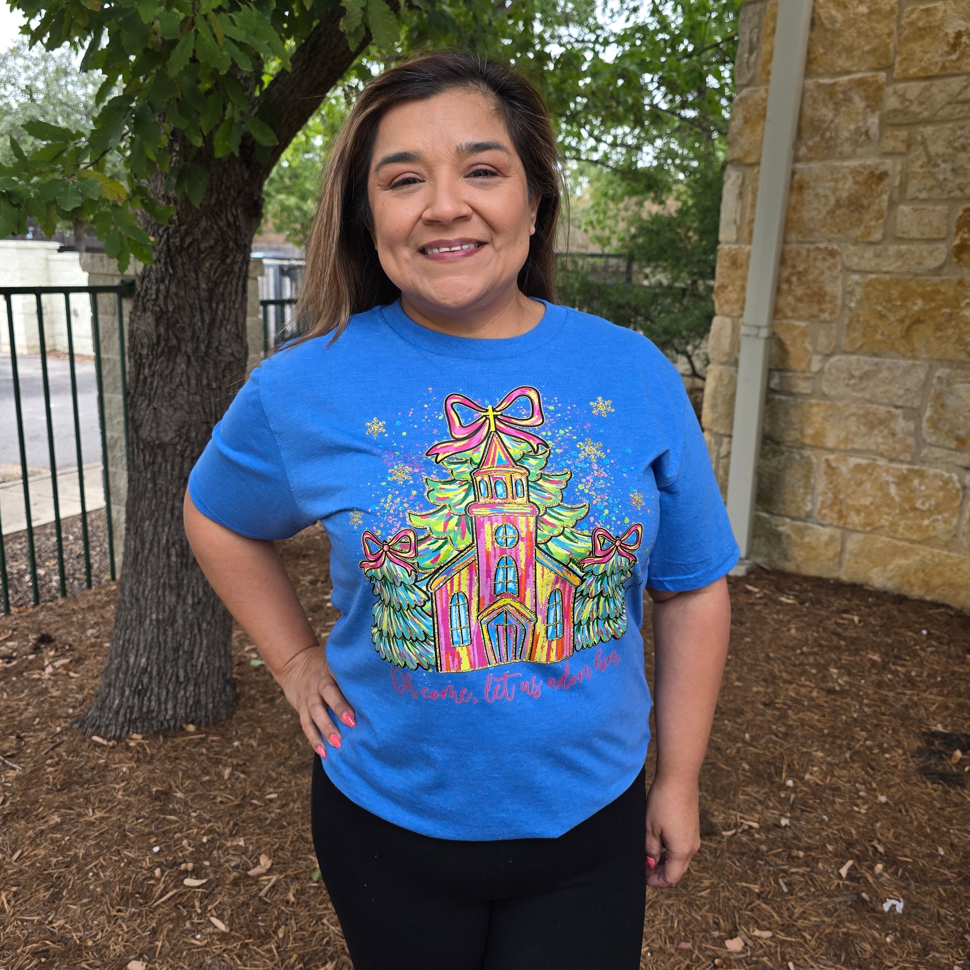 “Oh Come, Let Us Adore Him” Christmas Chapel Tee Celebrate the season in color and joy with this vibrant Christmas chapel graphic tee! Featuring a beautifully illustrated church surrounded by festive trees topped with bright bows, this design brings all the cheerful holiday vibes. The hand-drawn look, bold colors, and sprinkled star accents make it a standout piece for Christmas gatherings, church events, family photos, and everyday festive style.