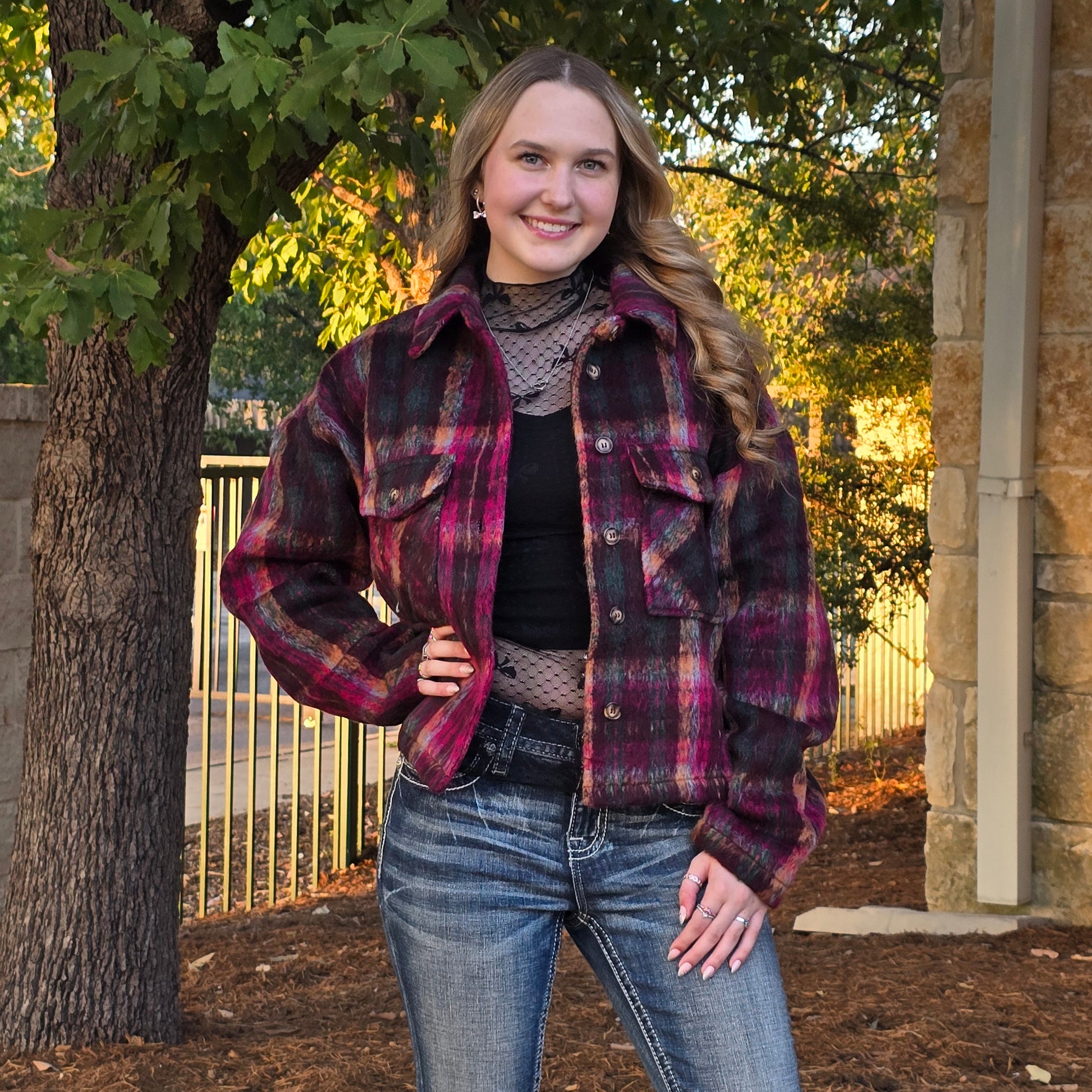 Meet your new fall and winter favorite — this ultra-cozy plaid shacket blends the warmth of a jacket with the easy, relaxed fit of a shirt. Featuring rich tones of burgundy, pink, plum, and charcoal, it adds the perfect pop of color to any cool-weather outfit.