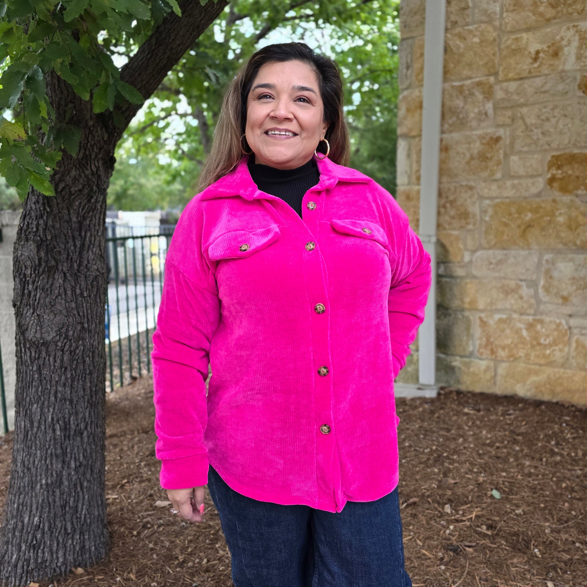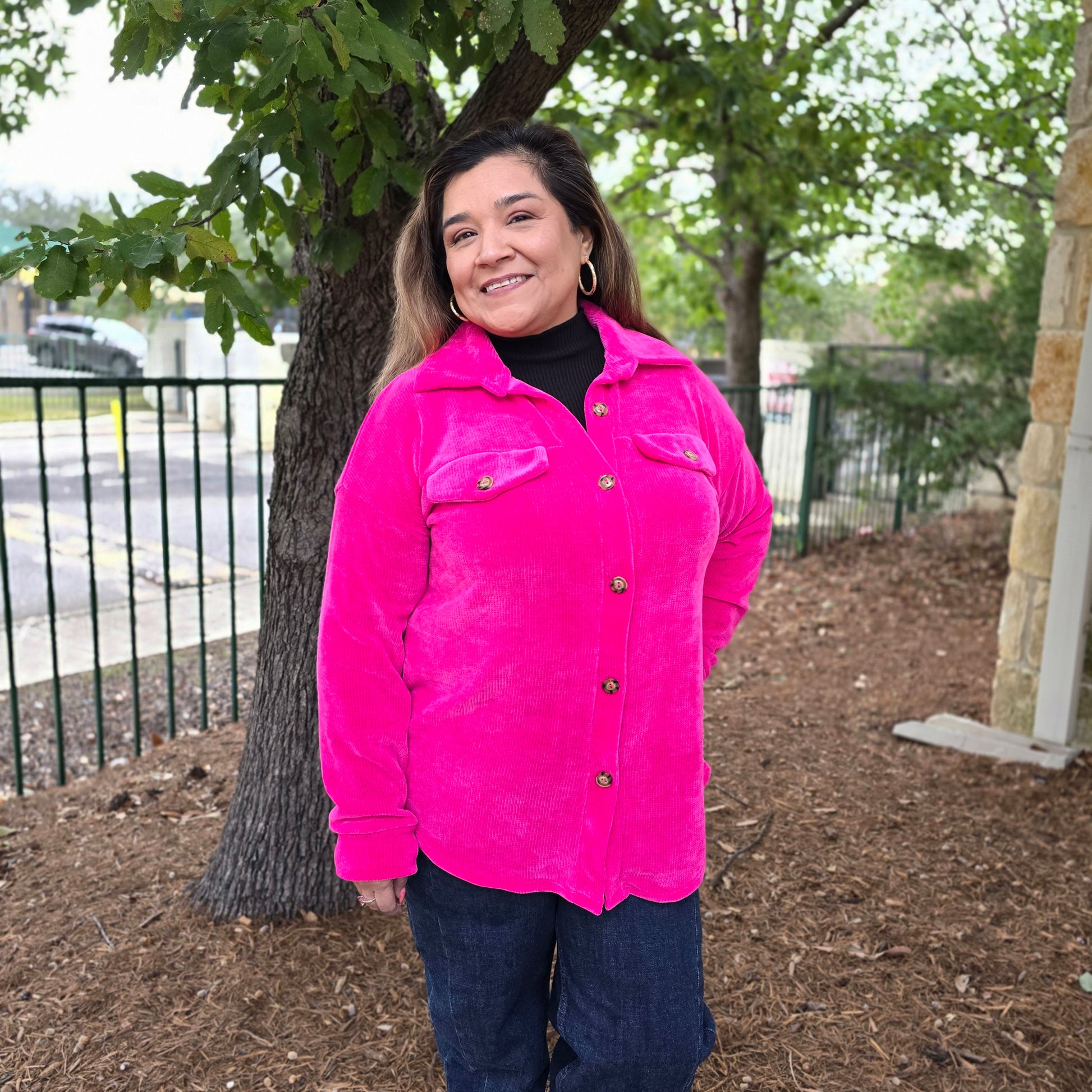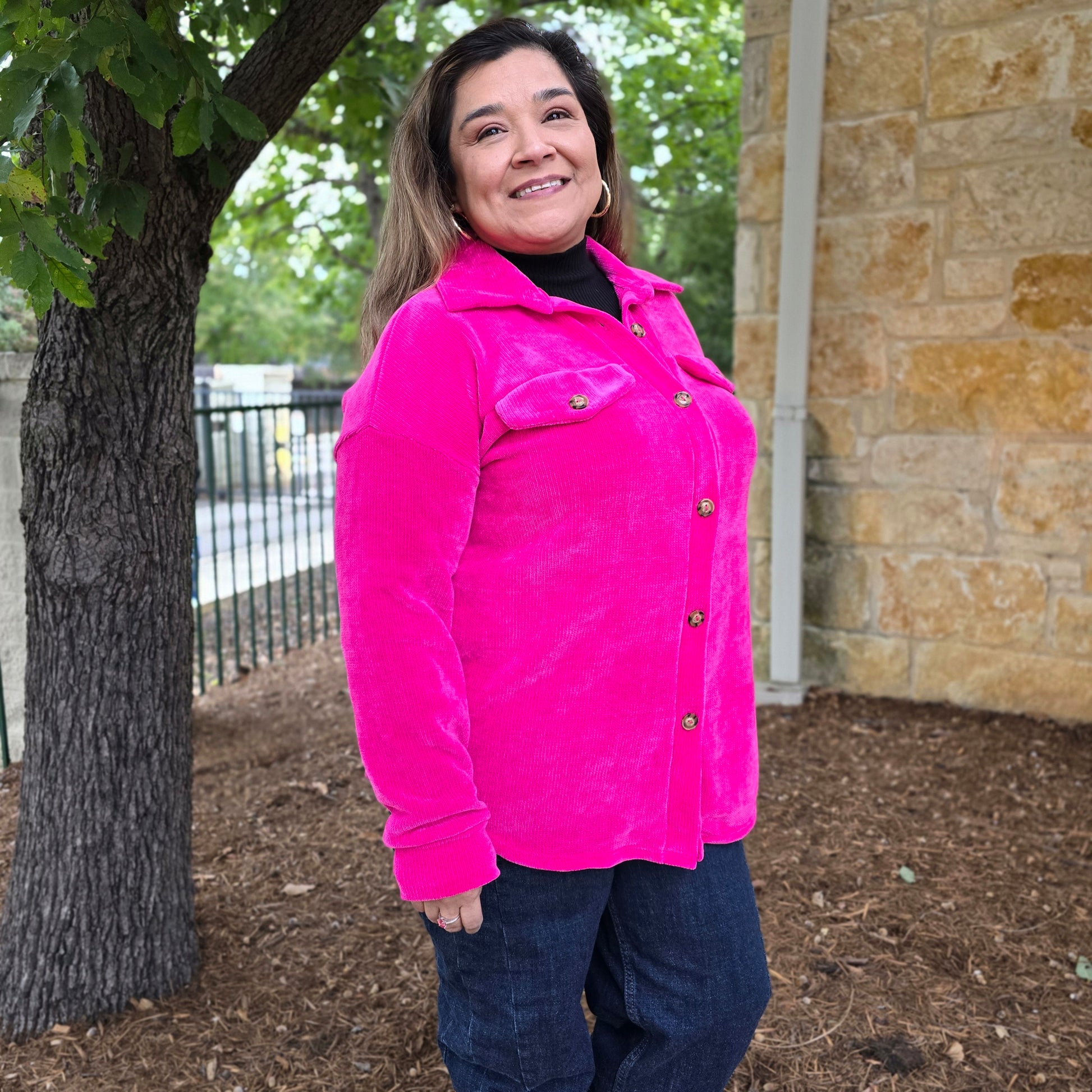 Features You’ll Love: Plush chenille texture — super soft to the touch Fully functional button-down front Chest pockets with button closures Relaxed, easy-to-layer fit Bold fuchsia color that makes every outfit pop