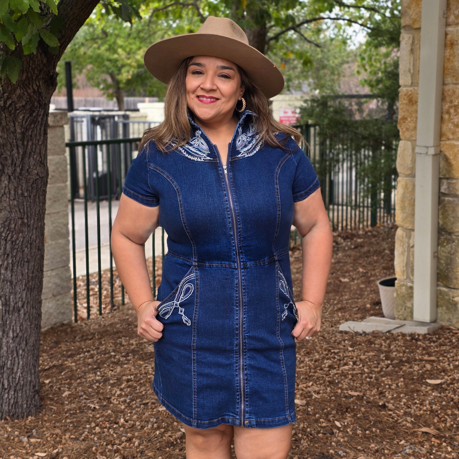 This denim dress brings classic western charm with a modern, flattering fit. Crafted from structured yet comfortable denim, it features eye-catching embroidered detailing along the collar and pockets for a subtle western-inspired touch. The full front zipper makes it easy to slip on and off, while the tailored seams create a flattering silhouette. Finished with functional front pockets, this dress is as practical as it is stylish—perfect for rodeo season, casual outings, or dressing up with boots and accessories.