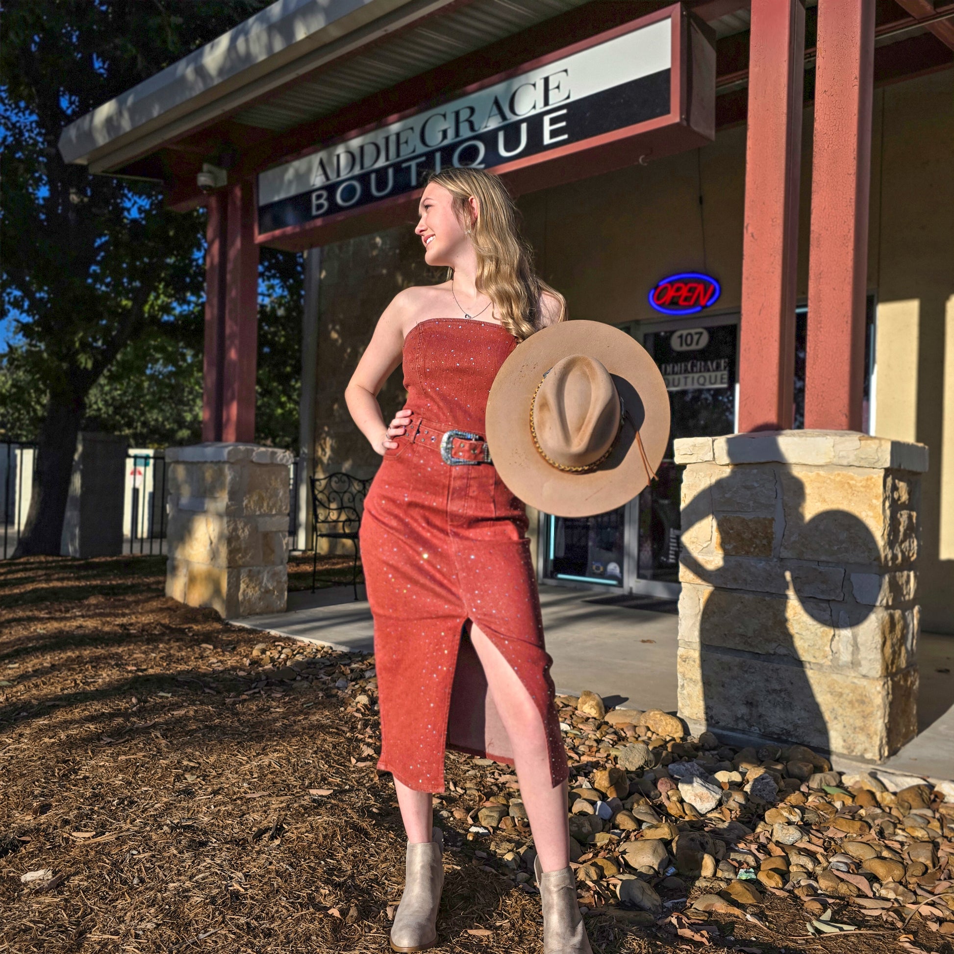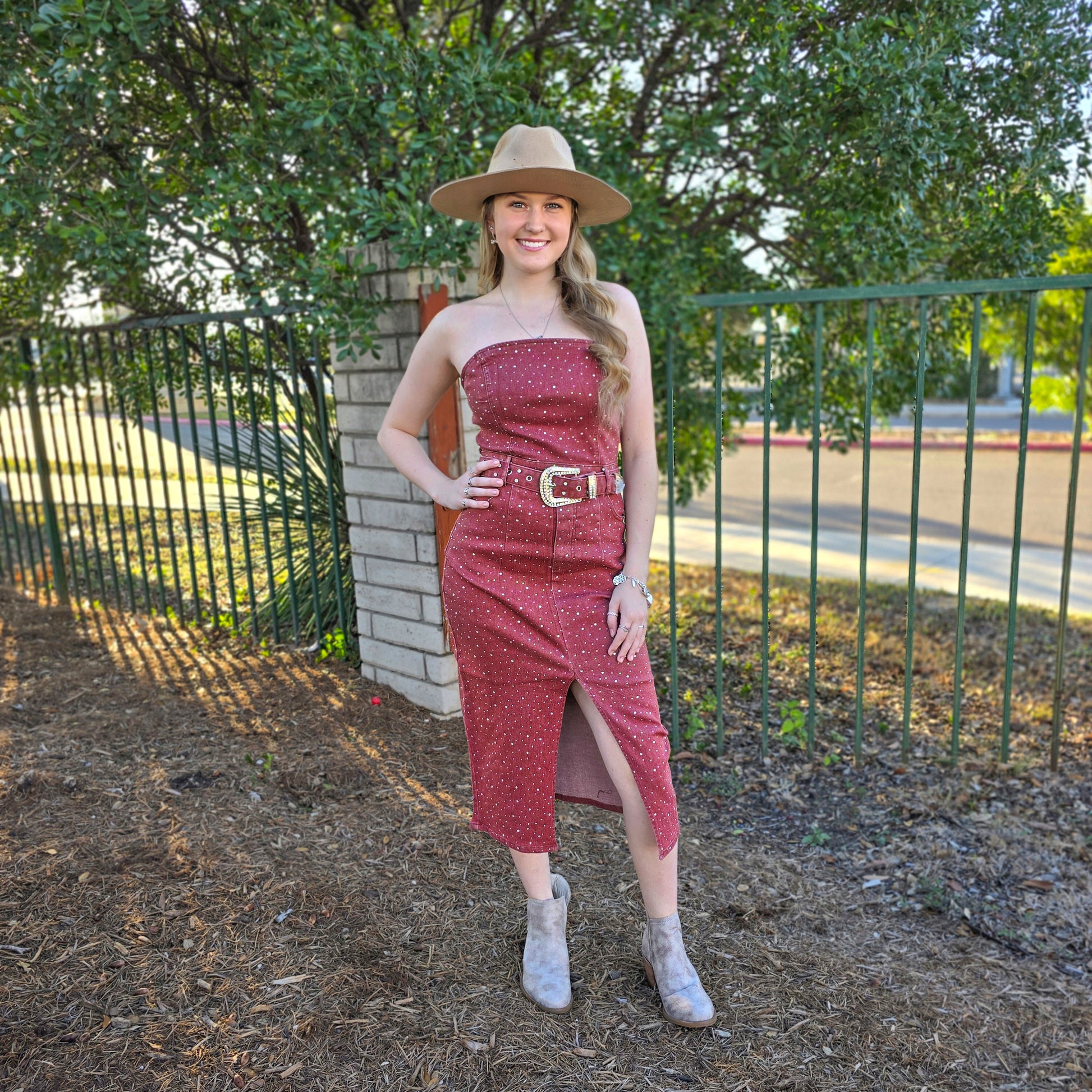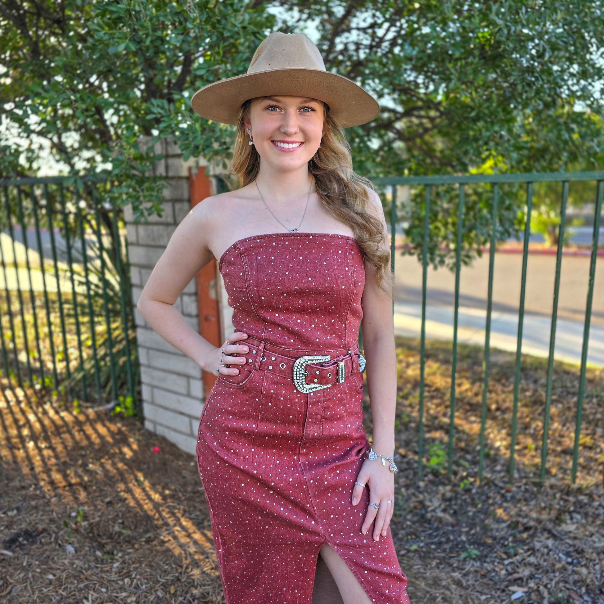 Turn heads in this stunning brick red strapless dress, designed to sparkle with subtle rhinestone detailing throughout. Crafted from a structured yet comfortable fabric, this dress hugs your curves in all the right places while the side slit adds a flirty, feminine touch. Perfect for western-chic nights, holiday parties, or special events, this dress shines whether styled with boots or heels. Denim