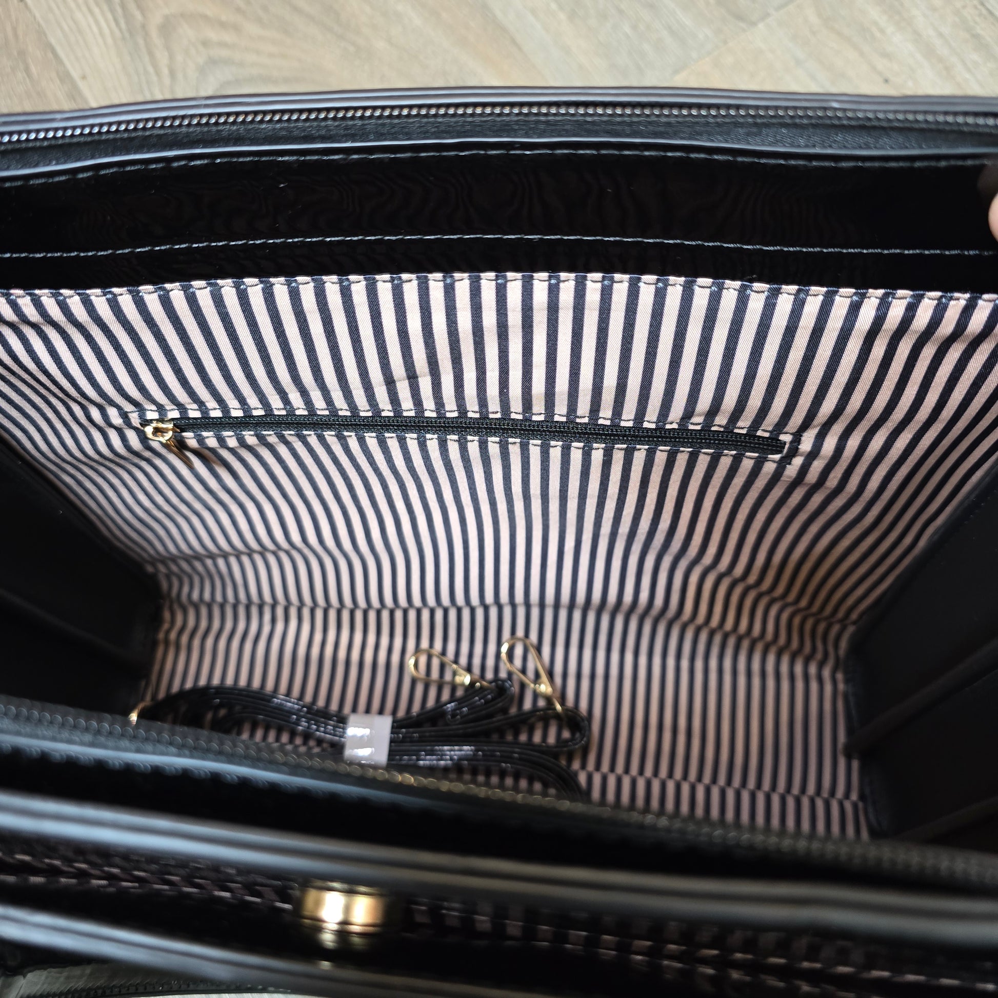 Carry it by the top handles for a classic look or attach the adjustable strap to wear it comfortably as a shoulder bag.