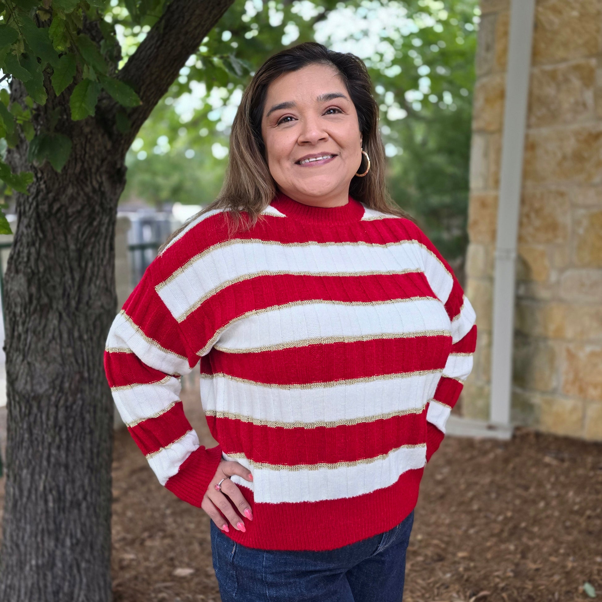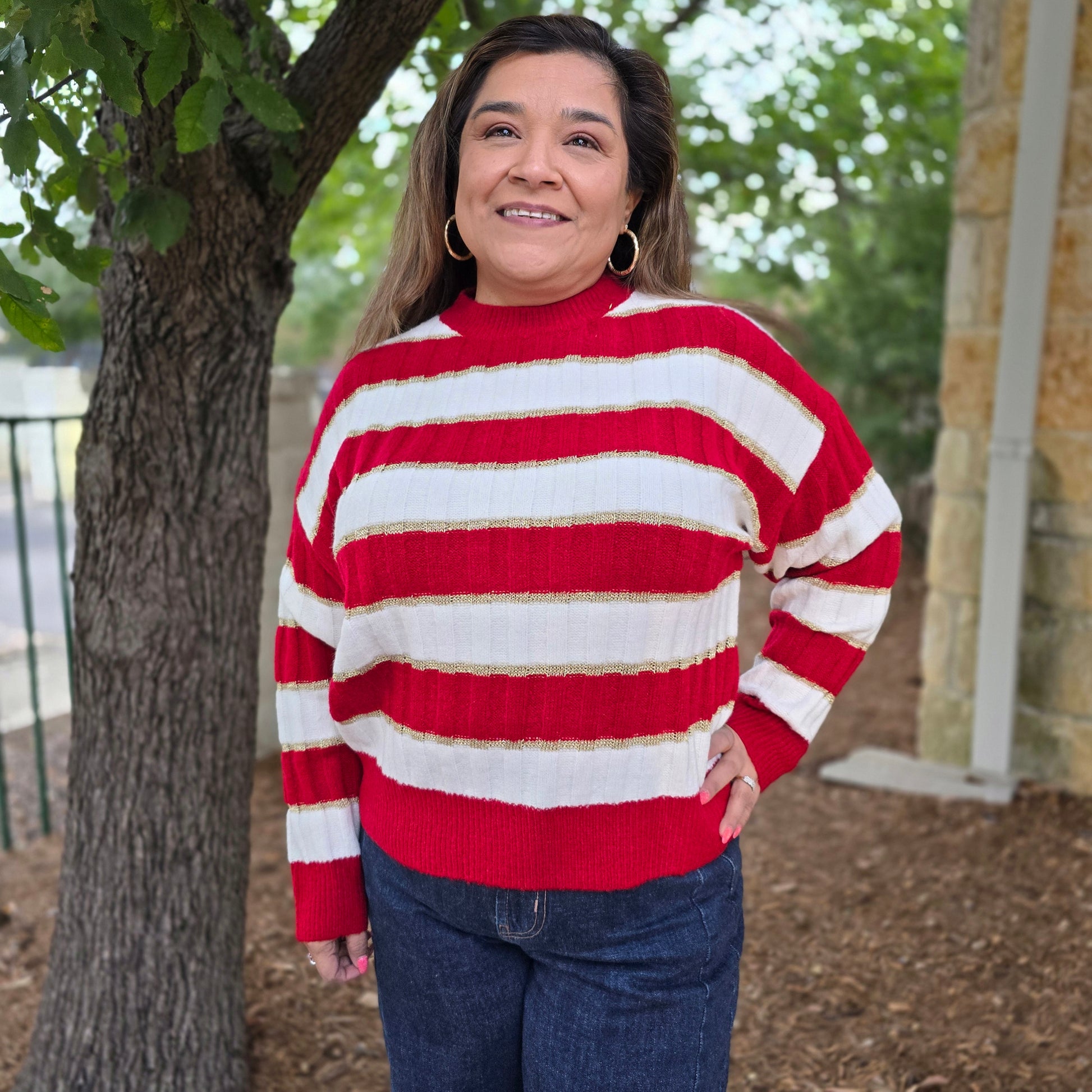 Sweet, festive, and effortlessly cozy — this striped sweater is the must-have piece your winter wardrobe has been waiting for! Featuring bold red and white stripes trimmed with a touch of gold shimmer, it brings the perfect blend of comfort and cheer for the holiday season and beyond.