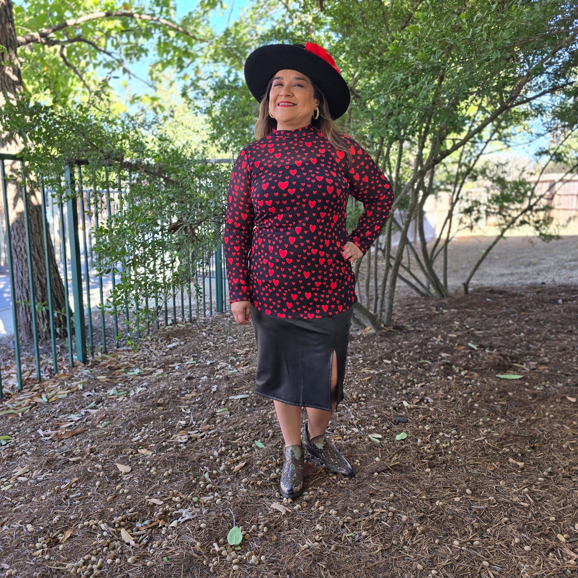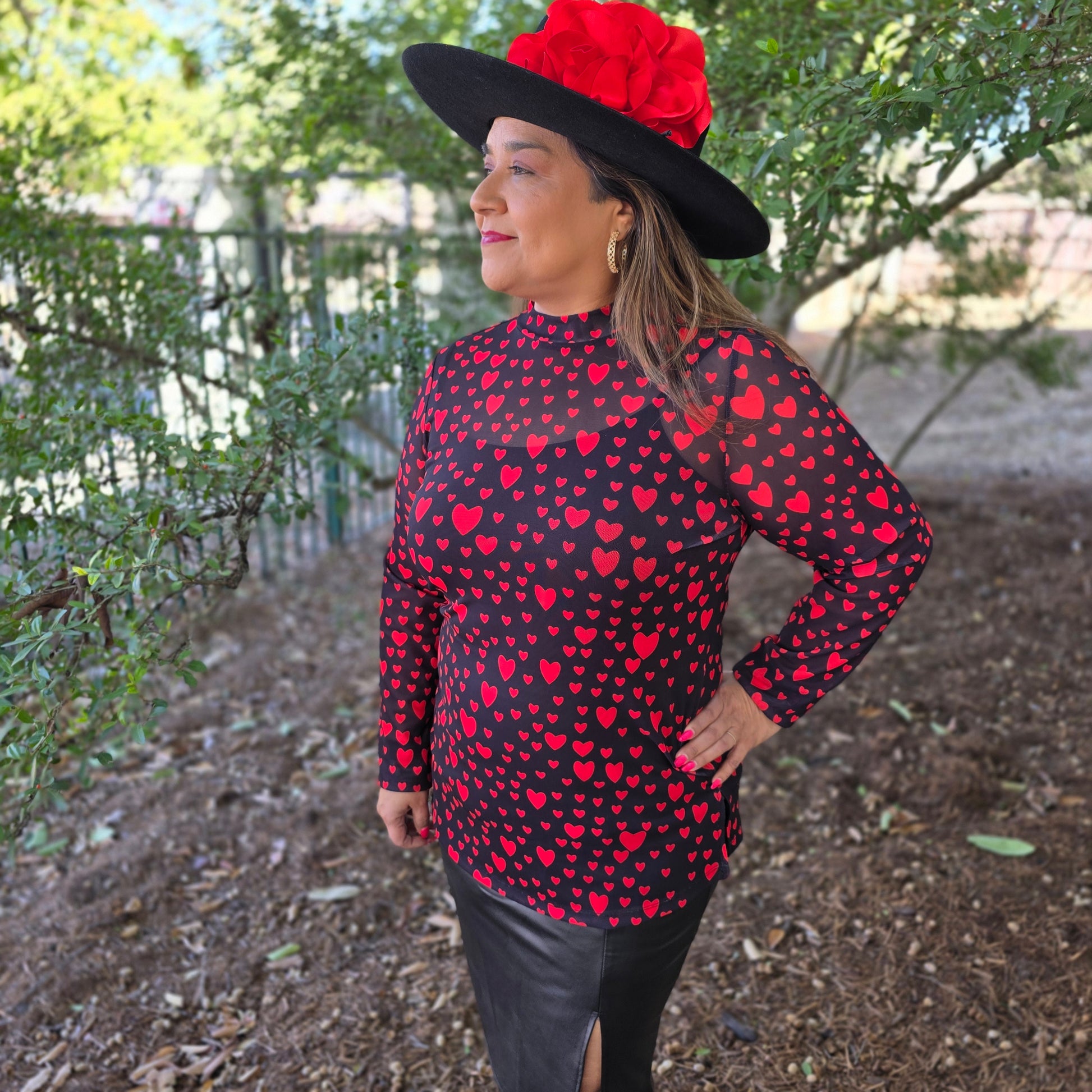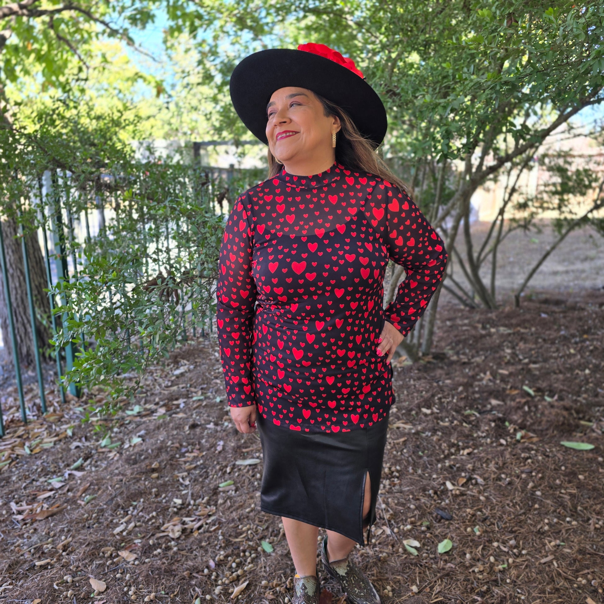 Turn heads and steal hearts. This statement mesh top features an allover red heart print on a sleek black base for a bold yet playful look. Designed with a fitted silhouette and mock neckline, it’s lightweight, breathable, and perfect for layering or wearing solo. The stretchy mesh fabric hugs just right while keeping things comfortable and flattering.