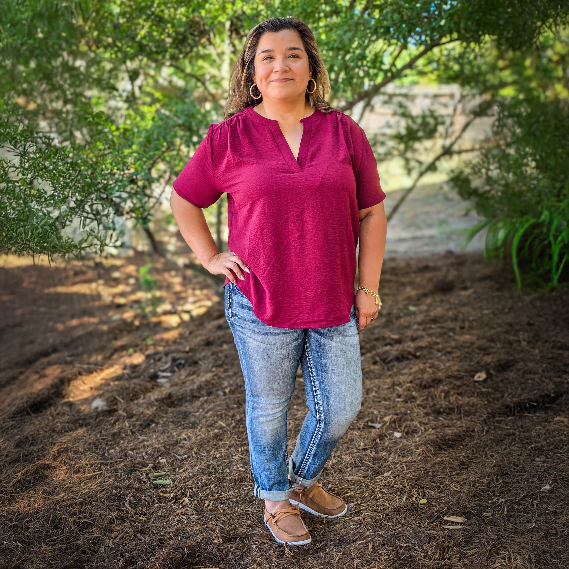 Add a pop of rich fall color to your wardrobe with this V-Neck Textured Blouse in a gorgeous wine hue. Designed with a soft, lightweight fabric and subtle texture, this top offers just the right mix of comfort and polish.
