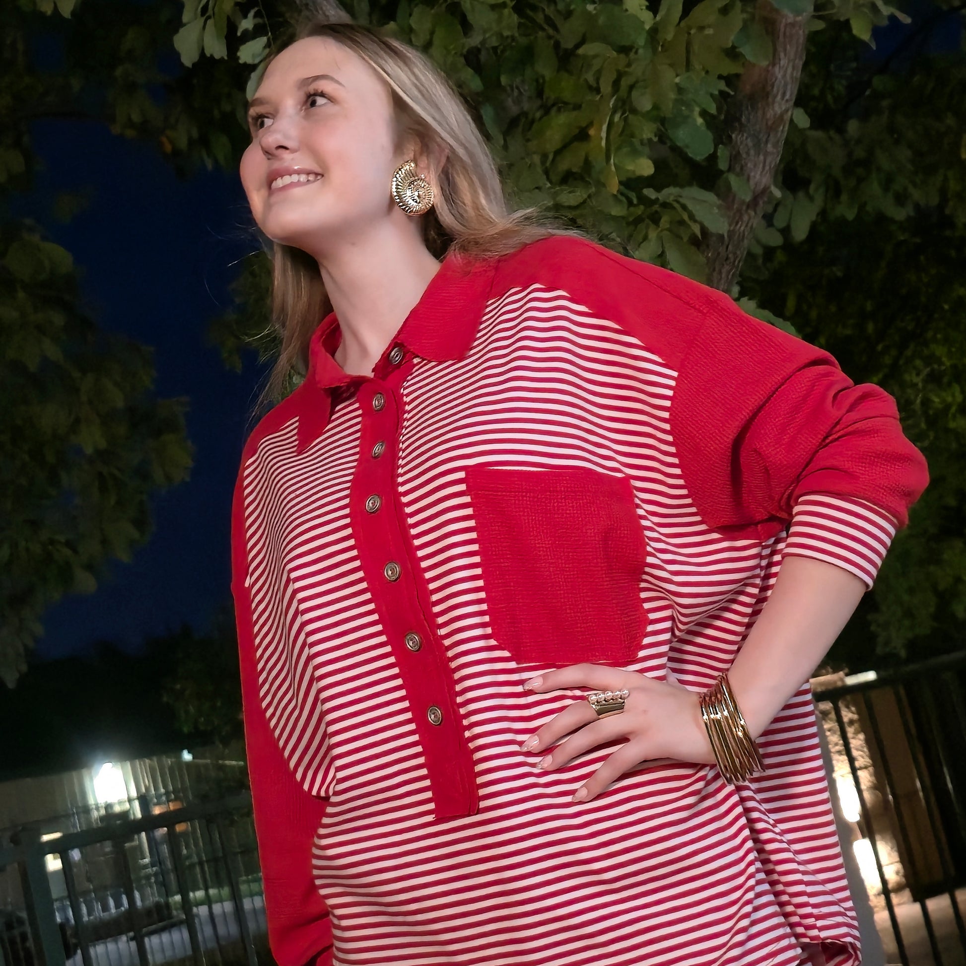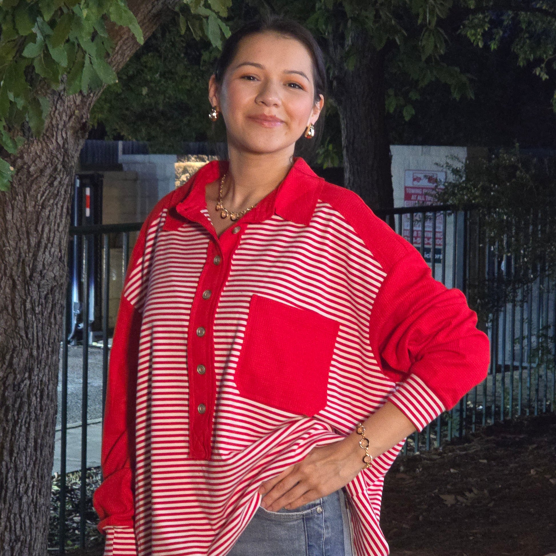 Cozy, cute, and effortlessly festive — this oversized striped pullover is the perfect blend of comfort and style! Featuring bold red and white stripes with solid red contrast details, this top brings a fun pop of color while keeping things relaxed and easy to wear. The button-up front, roomy drop-shoulder sleeves, and oversized chest pocket add that trendy, casual charm customers love.