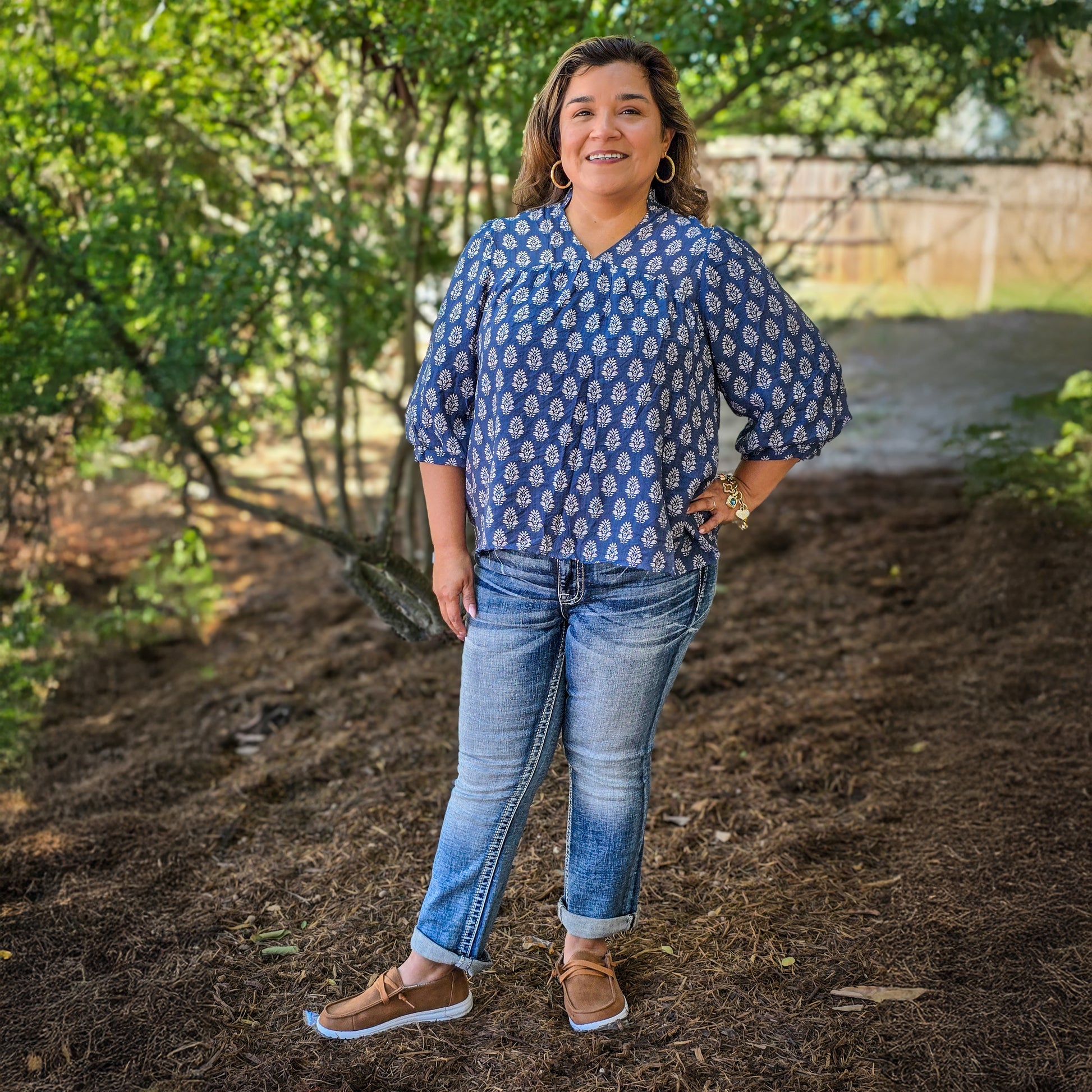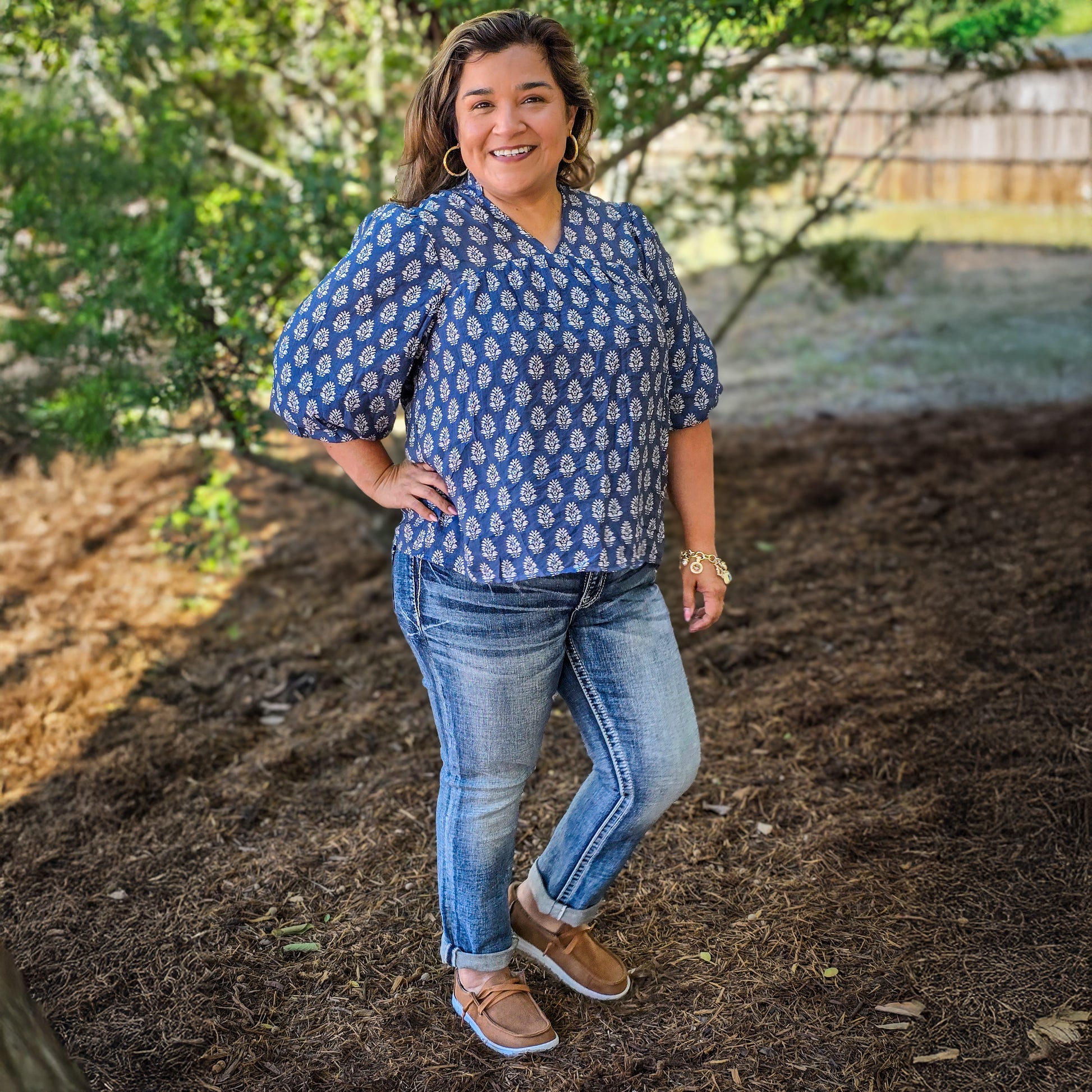 Effortlessly chic and perfect for everyday wear, this Blue Puff Sleeve Print Top is all about comfort and charm. The soft blue background with a delicate white print gives it a timeless, easygoing look, while the puff sleeves add a fun, feminine touch.